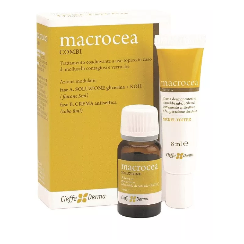 Prodotto ad azione modulare che comprende: una soluzione di glicerina + KOH in grado di svolgere un’azione efficace contro verruche o mollusco contagioso e una crema antisettica per potenziare e completare l’azione virucida del trattamento.