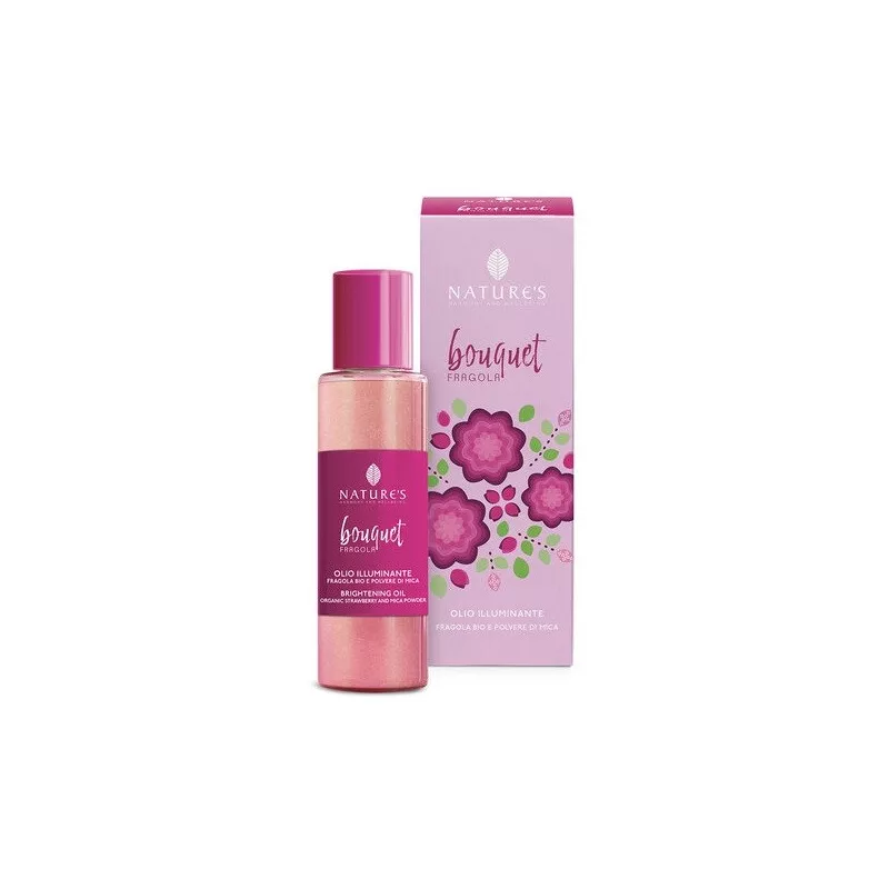 Olio multiuso che racchiude un concentrato di oli emollienti, di polvere di mica e di estratti naturali di fragola bio e pesca, che proteggono la pelle dalla secchezza.