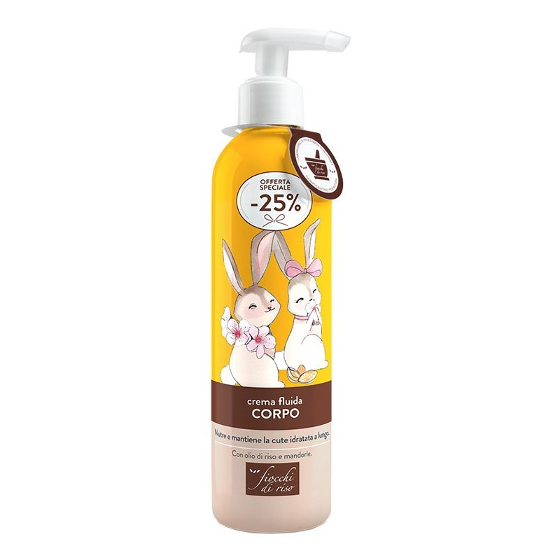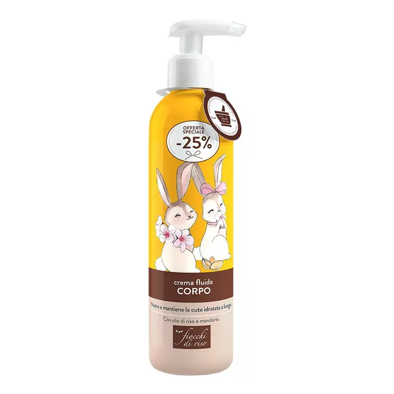 Crema corpo fluida con olio di riso e Mandorle che nutre e mantiene la cute idratata a lungo.