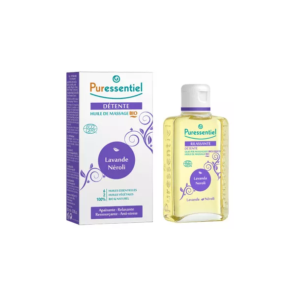 Prodotto cosmetico. L'olio da massaggio rilassante unisce ai benefici del massaggio le virtù degli oli essenziali di Lavanda, Neroli, Camomilla romana, Maggiorana, Arancio amaro e Ylang Ylang, per lenire le tensioni quotidiane e favorire un ritorno alla calma e a un sonno sereno. Gli oli vegetali di Sesamo e Mandorla dolce, nutrienti e ammorbidenti, favoriscono un massaggio dolce e rilassante e offrono ai grandi e ai piccoli un trattamento di piacere anti-stress ideale. Prodotto 100% biologico e naturale. Non macchia.
