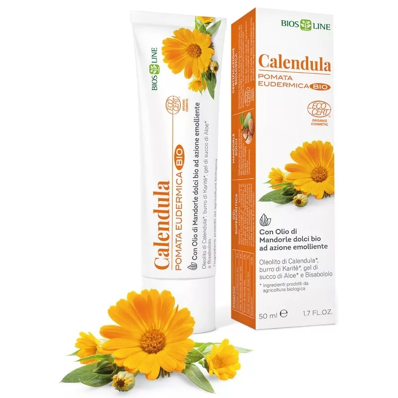 a base di Oleolito di Calendula bio, olio di Girasole bio, burro di Karitè bio, gel di succo di Aloe bio, Bisabololo e con un particolare olio di Mandorle dolci bio titolato in Beta-sitosterolo. La Pomata Eudermica Bio Calendula è indicata per un effetto calmante su pelle arrossata, irritabile ed eritematosa, su scottature e ispessimenti cutanei (gomiti, ginocchia, talloni).