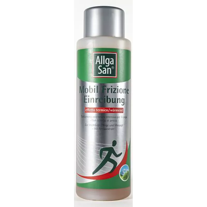 Mobil Frizione della linea Allga San effetto termico agisce con una intensa sensazione di calore, particolarmente indicata per frizioni e massaggi. Grazie alla particolare combinazione dell’originale olio di pino mugo delle montagne bavaresi dell’Algovia con olio di salvia, olio di rosmarino ed altri ingredienti attivi, il prodotto svolge un benefico effetto riscaldante.