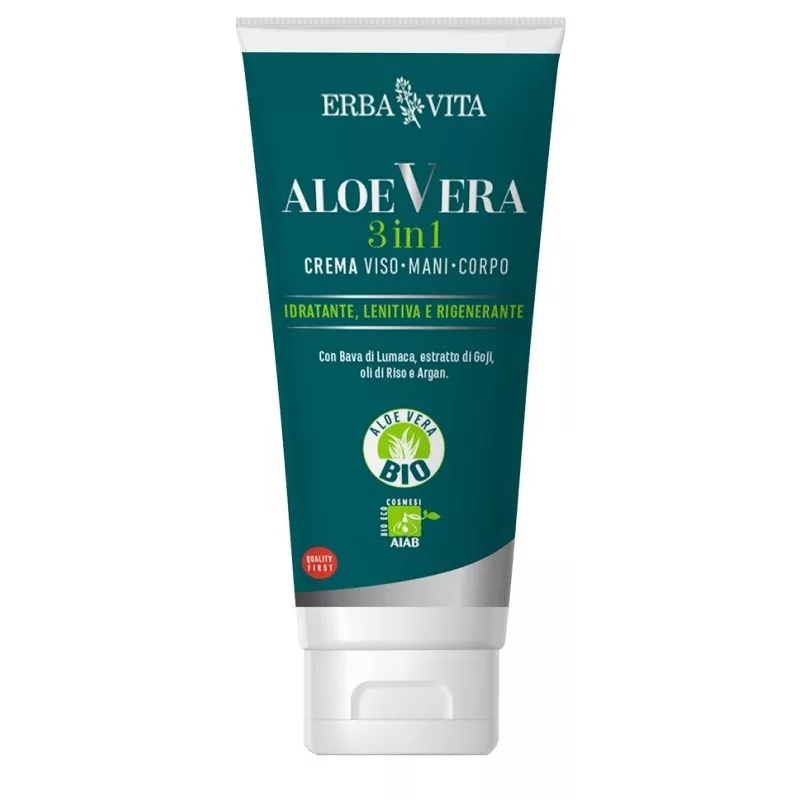 Aloe Vera Crema 3 in 1 è un prodotto che, con un unico gesto, si prende cura di ogni parte del corpo, in maniera specifica, mirata e completa. Si stende con facilità grazie alla sua texture leggera e piacevole e si assorbe velocemente, senza ungere la pelle. Oltre all’aloe vera, ingrediente attivo principale della formula, sono stati aggiunti bava di lumaca, bacche di goji e oli di riso e argan, per favorire l’idratazione del viso, proteggere le mani e donare morbidezza a tutto il corpo.