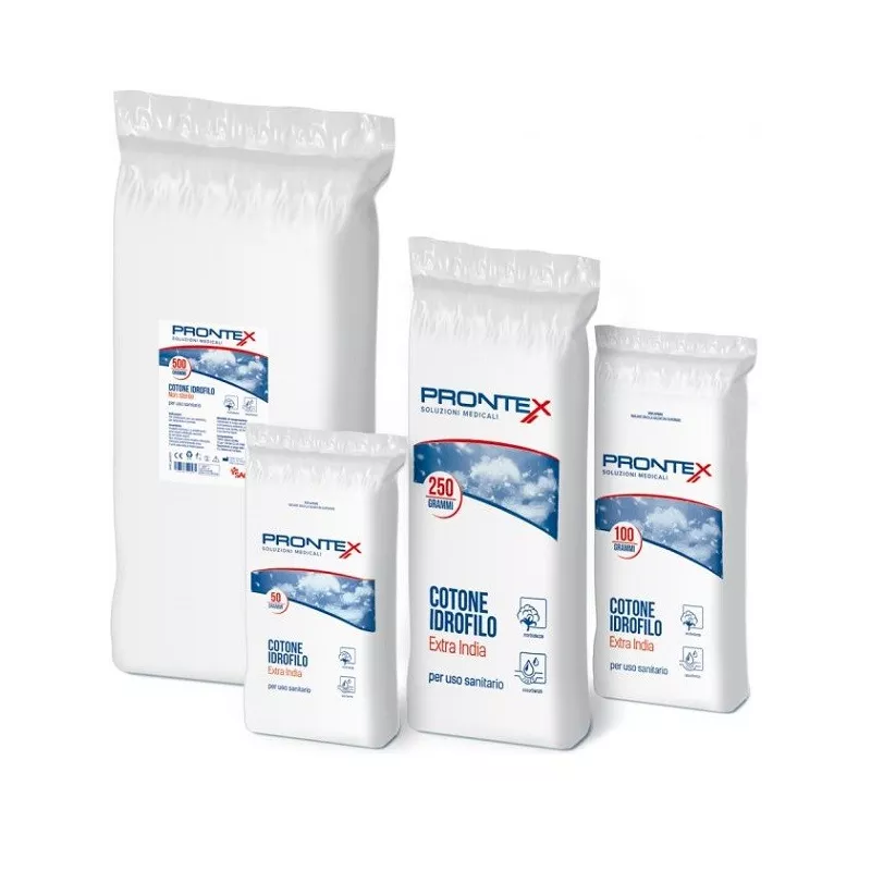 Cotone idrofilo Extra India per uso sanitario e cosmetico Esplora la morbidezza e la versatilità con PRONTEX COTONE Extra India, disponibile in cinque formati differenti (50g, 100g, 250g, 500g, 1000g). Questo pregiato cotone rappresenta la scelta perfetta per l' esigenze di cura personale e igiene quotidiana.