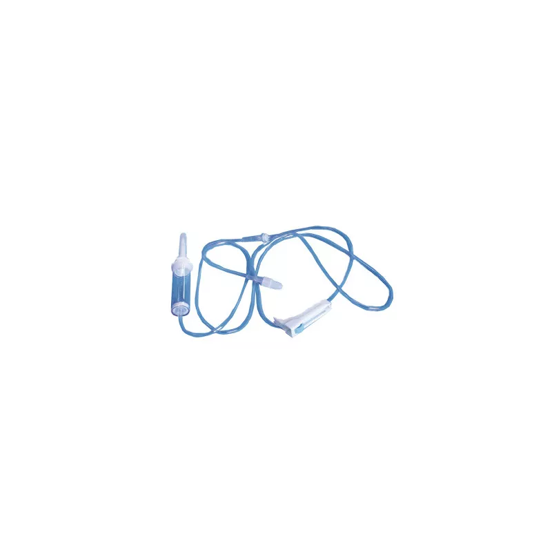 Con perforatore a due vie in ABS con cappuccio, tappino con filtro antibatterico idrorepellente, camera di gocciolamento con filtro soluzione 15 µm, tubi in PVC dalla lunghezza totale di 150 mm, stringi-tubo a roller, punto di iniezione a Y latex free posto a 20 cm dal raccordo d'innesto all'ago.
