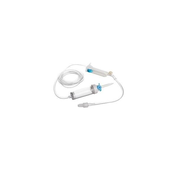 Deflussore per infusioni. Sterile, apirogeno, monouso, presa d'aria antibatterica per la somministrazione a caduta di soluzioni perfusionali.
