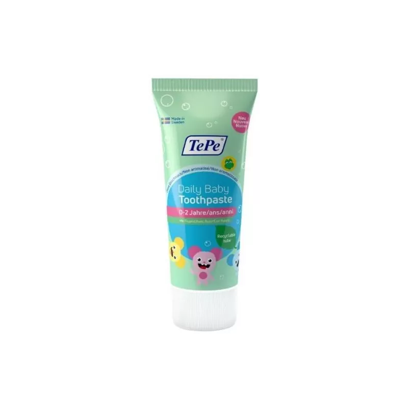 Dentifricio delicato per tutti i giorni per i più piccoli. Il dentifricio contiene il livello di fluoro raccomandato e adatto all'età per i bambini per aiutare a prevenire la carie. Il dentifricio è privo di SLS, vegano e realizzato con pochi ingredienti attentamente selezionati, sviluppati in collaborazione con esperti del settore dentale. Il dentifricio TePe Daily Baby è un dentifricio senza sapore né coloranti. Una delicata protezione fin dal primo dentino, per bambini da 0 a 2 anni.