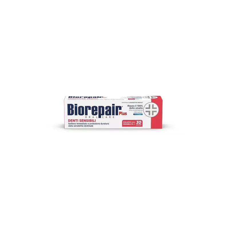 Dispositivo medico ripara smalto che forma sul dente una barriera naturale contro l’ipersensibilità per un rapido sollievo dal dolore. La formula ad alta concentrazione di microRepair di Biorepair Plus Denti Sensibili deposita sui denti il 50% di smalto in più prevenendone l’erosione e riparandolo; grazie alla maggiore concentrazione di principio attivo, aiuta a prevenire le cause della sensibilità dentinale e la riduce, laddove presente, occludendo i tubuli dentinali impedendo agli stimoli termici di raggiungere il nervo del dente.