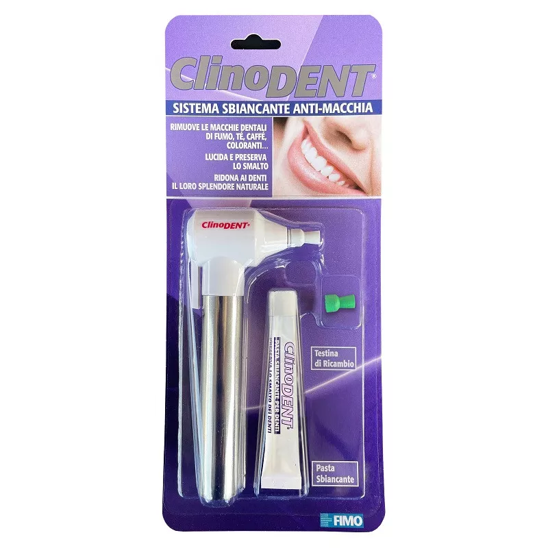 ClinoDENT consente di rimuovere le macchie dentali provocate da agenti esterni (fumo, caffè, tè, alimenti coloranti, clorexidina, etc.) svolgendo contemporaneamente un'azione di profonda pulizia e lucidatura dello smalto dentale.