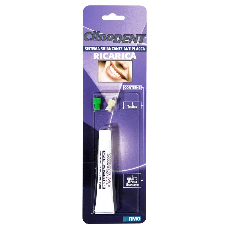 Ricambi per i Sistemi Sbiancanti Antiplacca Clinodent a batterie. È un sistema che permette di ritrovare un sorriso smagliante in modo semplice ed efficace. I sistemi Clinodent a batteria funzionano come quelli professionali per eliminare le macchie derivate da fumo, caffé, tè, coloranti, etc. e a prevenire la formazione della placca dentale. Questi apparecchi ideati scientificamente sono costituiti da una testina rotante che permette l'applicazione di una pasta sbiancante che lucida i denti. Questi sistemi funzionano a pile e non occupano più posto di un normale spazzolino da denti così che possono essere anche facilmente trasportati.