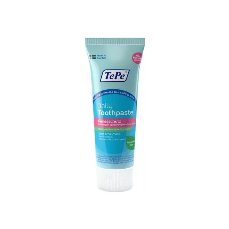 Dentifricio quotidiano delicato con fluoro per aiutare a prevenire la carie. Il dentifricio vegano è realizzato con ingredienti accuratamente selezionati, sviluppati in collaborazione con esperti di odontoiatria. Il dentifricio ha un sapore delicato di menta piperita che lo rende adatto a chi desidera un dentifricio delicato. Questo dentifricio è privo di SLS, un agente schiumogeno che può irritare i tessuti orali sensibili, ed è quindi perfetto per chi desidera un dentifricio che crei poca schiuma per uno spazzolamento confortevole. La linea di dentifrici TePe Daily è disponibile in tre varietà: per adulti, bambini e bimbi piccoli con livelli di fluoro adeguati all'età.