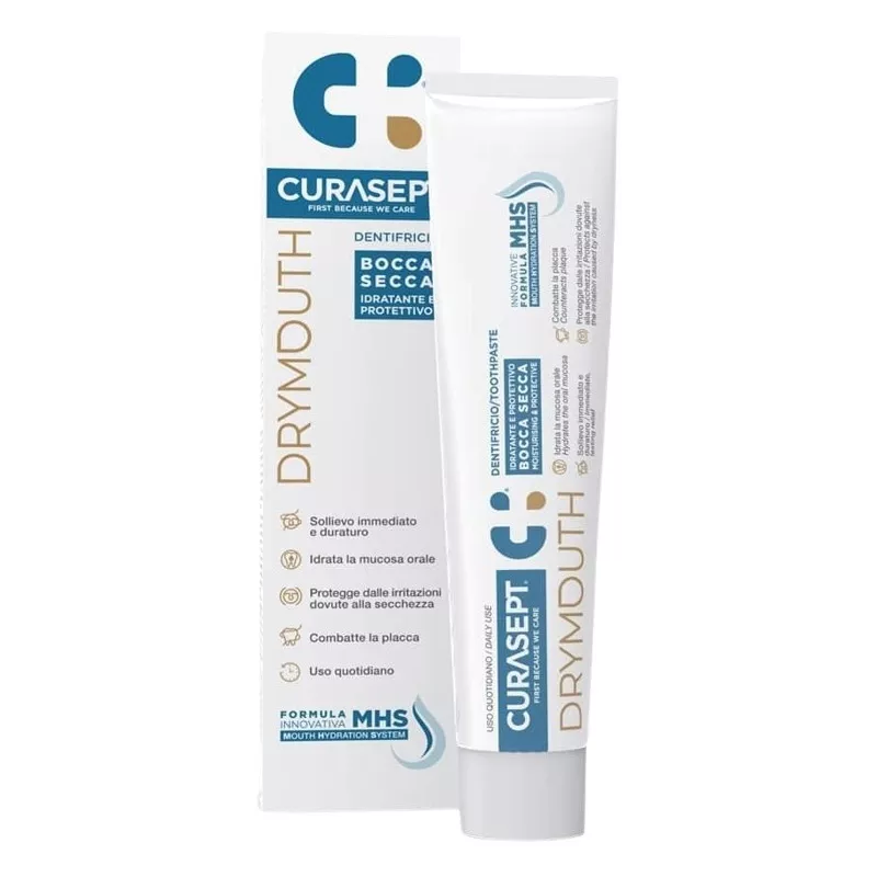 Indicato per chi soffre di bocca secca. Grazie alla formula arricchita con MHS (mouth hydration system), un mix equilibrato di sostanze idratanti, il dentifricio curasept drymouth dona una prolungata sensazione di benessere a tutto il cavo orale, soprattutto in caso di secchezza. Favorisce la protezione del cavo orale, riducendo il rischio di carie e stimolando l'idratazione delle mucose orali.