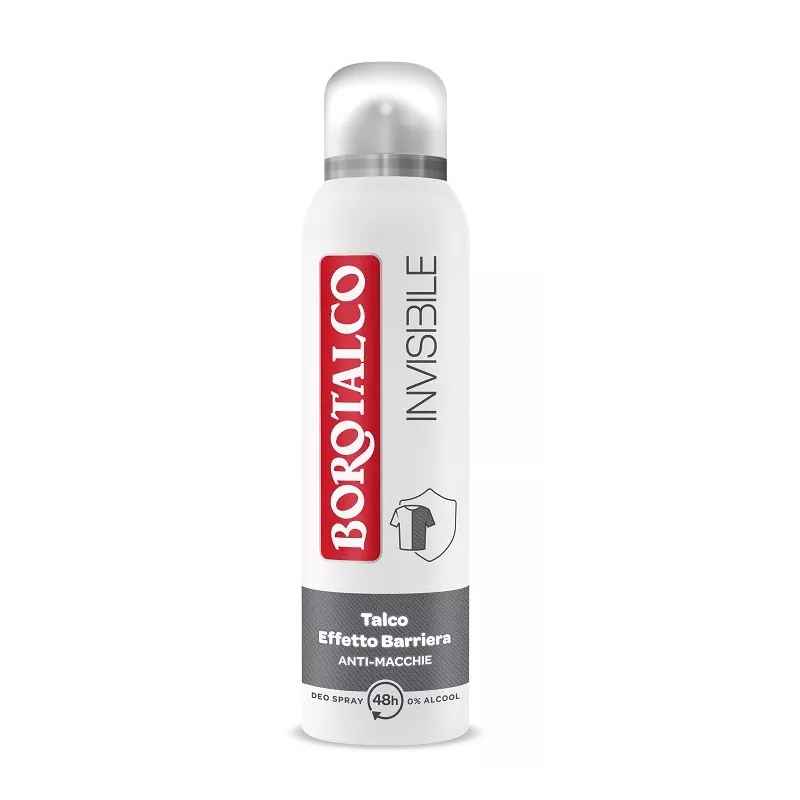 Formula Talco Effetto Barriera che unisce la protezione asciutta della polvere di talco con una rete di molecole invisibili che cattura e non trasferisce aloni, odori e macchie, creando un effetto barriera tra pelle e vestiti per un asciutto anti-macchie.