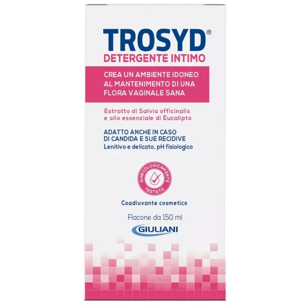 Detergente per l'igiene intima quotidiana, ginecologicamente testato, che favorisce il ripristino delle naturali barriere fisiologiche. In questo modo l'ambiente vaginale risulta idoneo al mantenimento di una flora sana ed è meno soggetto ad aggressioni esterne che generano situazioni di discomfort quali prurito, arrossamento o fastidio in generale. Grazie alle sue proprietà lenitive, infatti, allevia gli stati irritativi della cute e delle mucose esterne. Trosyd detergente intimo è adatto anche in presenza di candida o di sue frequenti recidive. Completano la formula l'estratto di Salvia officinalis e l'olio essenziale di eucalipto, dalle riconosciute proprietà antimicotiche.