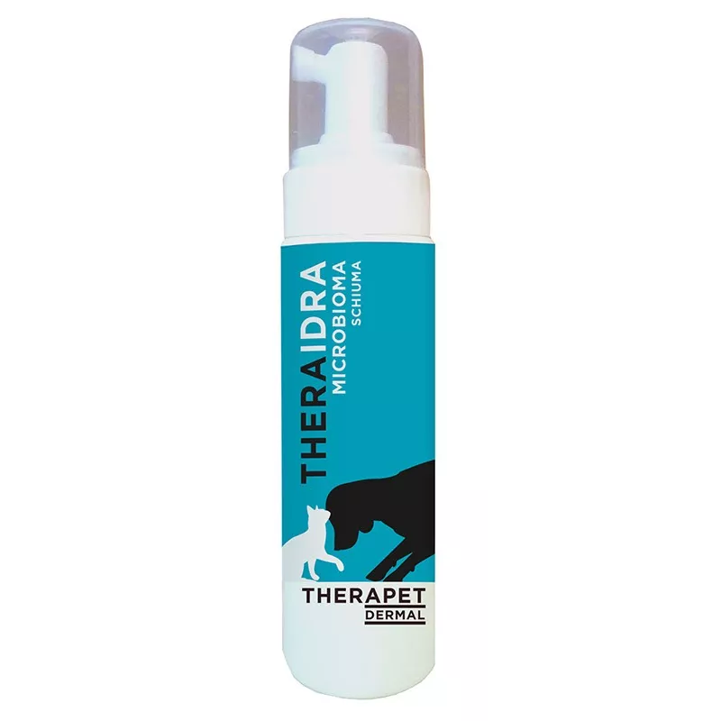 Schiuma detergente ad uso cutaneo per cani e gatti a base di sostanze lipidiche emollienti e ceramidi, utili per il mantenimento dell’integrità della funzione barriera cutanea. La formulazione è arricchita con BIOME21®, un mix di ingredienti in grado di supportare la normale funzionalità del microbioma cutaneo. theraidra microbioma schiuma detergente garantisce una pulizia delicata del manto ed un’azione protettiva mantenendo le naturali difese della pelle. Pulisce senza l’utilizzo di acqua lasciando il pelo lucido, morbido e delicatamente profumato.