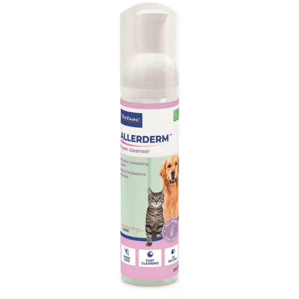 Schiuma Allerderm facile da applicare per pulire delicatamente e rapidamente la cute e il pelo degli animali domestici tra un bagno e l'altro. È composto da una soluzione di acqua micellare adatta a qualsiasi tipo di pelle, anche quella sensibile.
