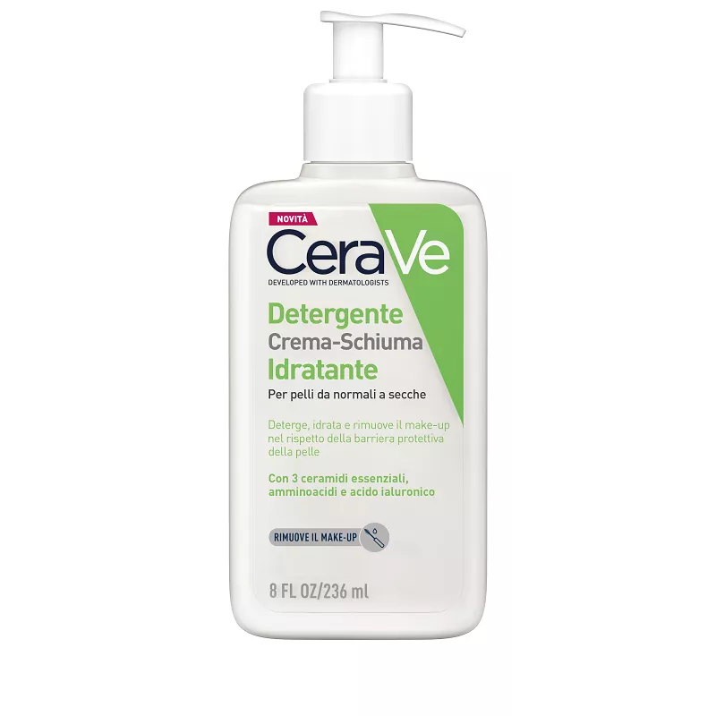 Crema schiumogena detergente idratante per pelli normali e secche. Deterge, idrata e rimuove il make up nel rispetto della barriera protettiva della pelle con 3 ceramidi essenziali, amminoacidi e acido ialuronico.