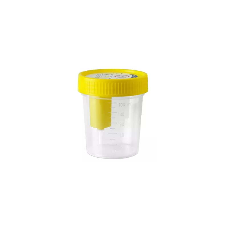 Contenitore destinato alla raccolta delle urine. Graduato fino a 100 ml. Tappo a vite a perfetta tenuta con dispositivo integrato per prelievo con provetta tipo sottovuoto. Corredato di etichetta autoadesiva.