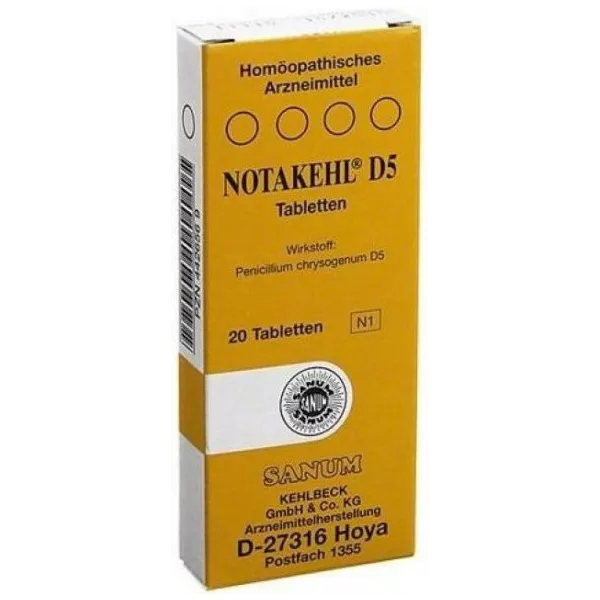 Notakehl è un medicinale prodotto dal fungo muffa Penicillium chrysogenum. Notakehl non è un antibiotico e non contiene o produce acido penicillino. Non sono state documentate possibili reazioni avverse come allergie alla penicillina, danni al fegato, distruzione della flora intestinale e formazione di ceppi resistenti alla penicillina, come avviene con il trattamento antibiotico. Analcolico.