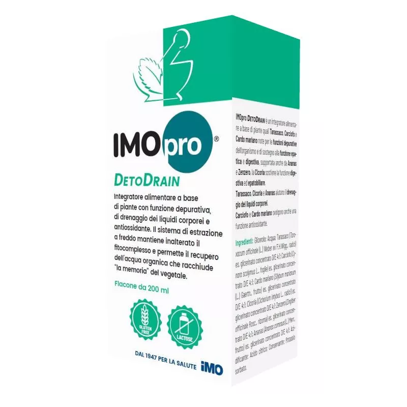 IMOpro DETODRAIN è un integratore alimentare a base di piante quali tarassaco, carciofo e cardo mariano note per le funzioni depurative dell'organismo e di sostegno alla funzione epatica e digestiva, supportata anche da ananas e zenzero, la cicoria sostiene la funzione digestiva ed epatobiliare. tarassaco, cicoria e ananas aiutano il drenaggio dei liquidi corporei. Carciofo e cardo mariano svolgono anche una funzione antiossidante.