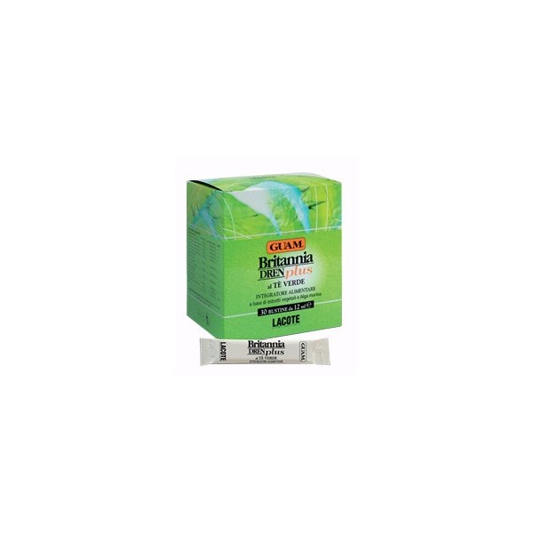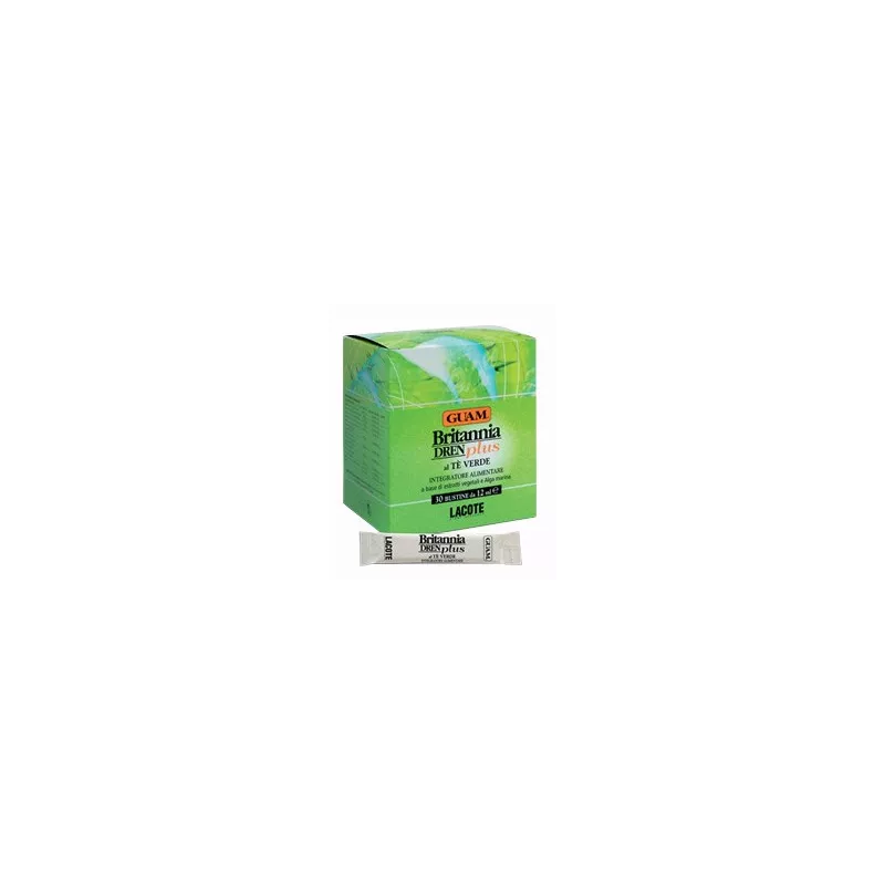Favorisce il drenaggio dei liquidi corporei grazie all'azione diuretica e depurativa dei suoi principi attivi. Britannia Dren Plus è un integratore alimentare al gusto tè verde, a base di estratti vegetali e alga marina. Associato all'utilizzo dei Fanghi d'Alga Guam ne sinergizza l'azione; in particolare è consigliato in abbinamento alla formulazione Fanghi d'Alga Guam Dren Plus che contrasta gonfiore e ritenzione idrica.