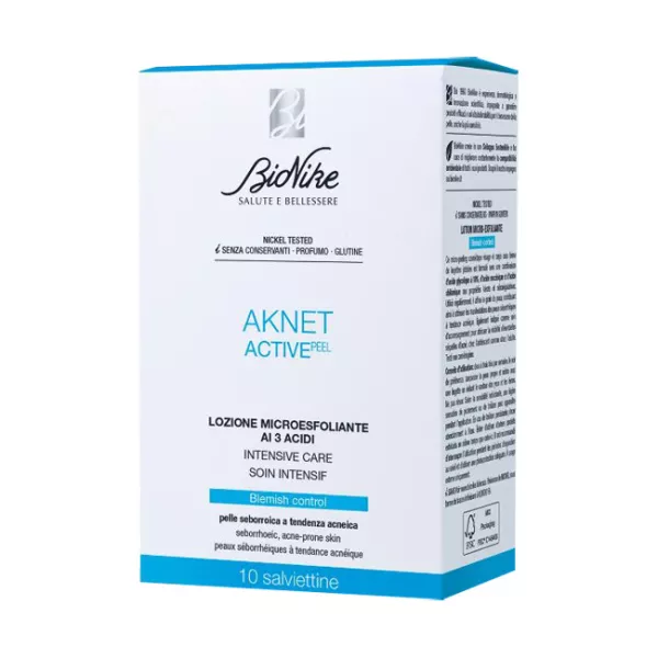 Cosmetico per viso e corpo in pratiche salviettine monouso. Formulato con la combinazione di acido glicolico 10%, acido succinico e acido shikimico dalle proprietà cheratonormalizzanti e seboregolatrici. Usato regolarmente, affina la grana della pelle, contribuendo ad attenuare le manifestazioni della pelle seborroica a tendenza acneica. Indicato anche come coadiuvante per ridurre la visibilità di eventuali segni residui, in età adolescenziale e adulta.