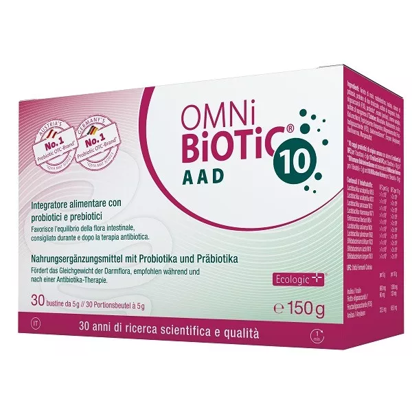 Modalità d'uso Per l’intera durata della terapia antibiotica, sciogliere 1 bustina di OMNi-BiOTiC 10 AAD (5 g) 2 volte al giorno in circa 125 ml di acqua, attendere almeno 1 minuto (tempo di attivazione), mescolare nuovamente prima di bere.