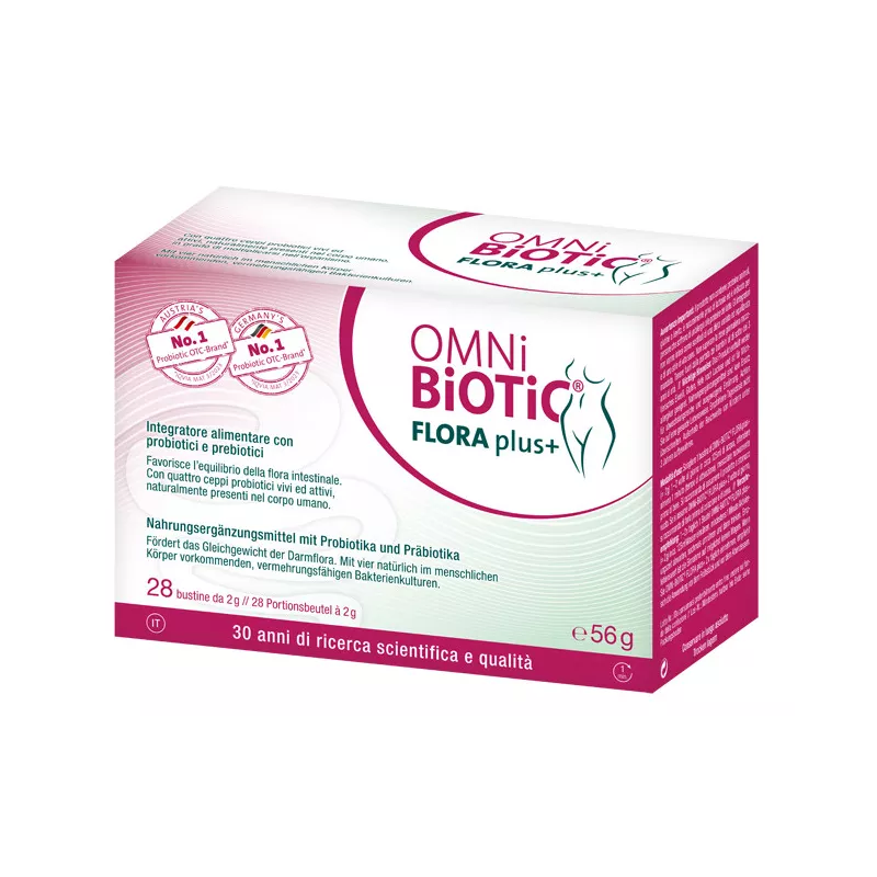 Modalità d'uso Sciogliere 1 bustina di OMNi-BiOTiC FLORA plus+ (2 g) 1–2 volte al giorno in circa 125 ml di acqua, attendere almeno 1 minuto (tempo di attivazione), mescolare nuovamente prima di bere.