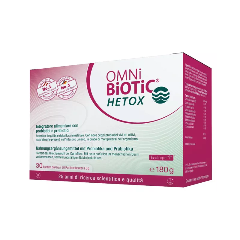 Modalità d'uso Sciogliere 1 bustina di OMNi-BiOTiC HETOX (pari a 6 g) 1 volta al giorno in circa 125 ml di acqua, attendere almeno 1 minuto (tempo di attivazione), mescolare nuovamente prima di bere. Si raccomanda di assumere il prodotto a stomaco vuoto.