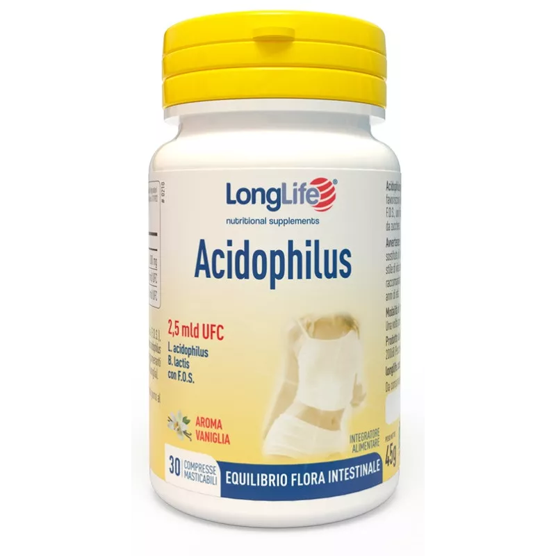 Ingredienti Frutto-oligosaccaridi a catena corta (F.O.S.), maltodestrina, agente di carica (cellulosa microcristallina), Lactobacillus acidophilus LA 3, Bifidobacterium animalis ssp. lactis BLC 1, antiagglomeranti (magnesio stearato vegetale e biossido di silicio), aroma (vaniglia).