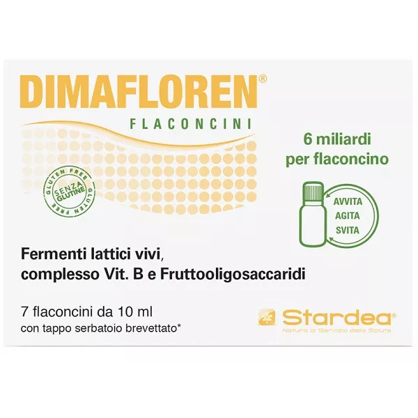 DIMAFLOREN contiene fermenti lattici vivi e fruttooligosaccaridi che favoriscono l’equilibrio della flora batterica intestinale. Le vitamine B6 e B12 contribuiscono alla normale funzione del sistema immunitario.