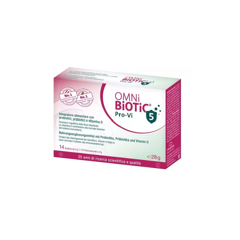 Modalità d'uso Sciogliere 1 bustina di OMNi-BiOTiC Pro-Vi 5 (2 g) 1-2 volte al giorno in circa 125 ml di acqua, attendere almeno 1 minuto (tempo di attivazione), mescolare nuovamente prima di bere. Si raccomanda di assumere il prodotto a stomaco vuoto.