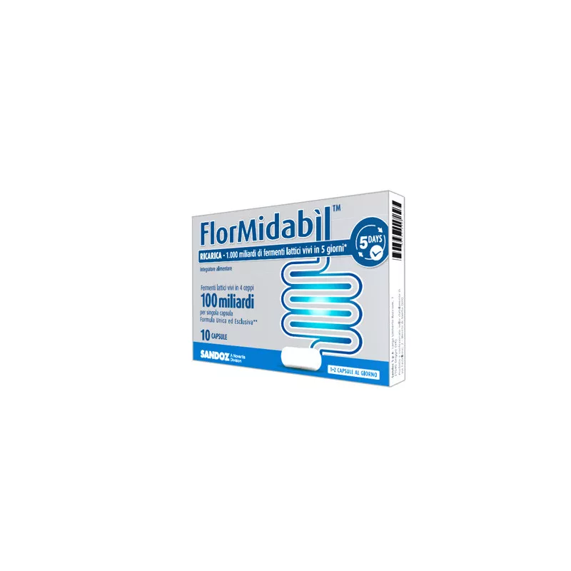 Flormidabìl RICARICA - 1.000 miliardi di fermenti lattici vivi Descrizione Integratore alimentare di fermenti lattici vivi. Flormidabìl Ricarica è a base di probiotici, presenti in una miscela costituita da 4 ceppi differenti, che favoriscono l'equilibrio della flora intestinale.