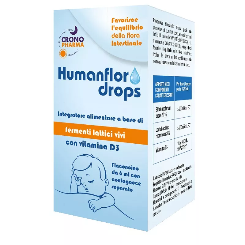 Humanflor drops, grazie alla presenza di quantità adeguate dei fermenti lattici B. breve M16V (NITE BP-02622) e L. rhamnosus GG (ATCC 53103), è in grado di favorire l’equilibrio della flora intestinale; inoltre la Vitamina D3 contribuisce alla normale funzione del sistema immunitario.