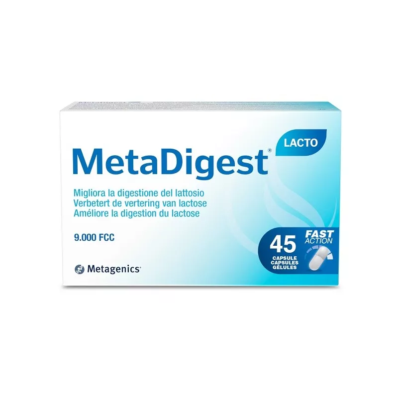Integratore a base di lattasi appositamente formulato per favorire la digestione del lattosio nei soggetti che mal digeriscono il lattosio di latte, formaggi o altri alimenti. Il dosaggio dell'enzima è molto elevato: 9.000 unita FCC per permettere una efficace e completa digestione enzimatica dello zucchero. Viene utilizzata una lattasi di origine fungina estratta dall'Aspergillus Oryzae la cui azione si esplica in un ampio range di pH (2-10). MetaDigest Lacto comincia la sua azione già nello stomaco. L'enzima utilizzato è ultra purificato e ad alta attività biologica.