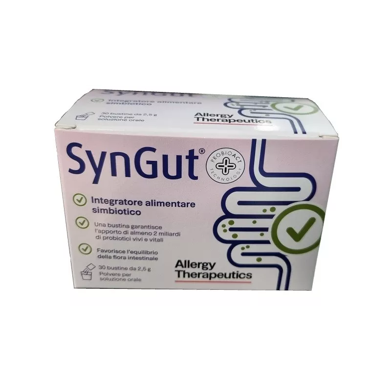 Descrizione Integratore alimentare simbiotico a base dei probiotici Bifidobacterium lactis W51, Lactobacillus acidophilus W22, Lactobacillus plantarum W21, Lactococcus lactis W19 ed inulina che favorisce il riequilibrio della flora intestinale. Il ceppo probiotico Lactobacillus acidophilus W22 è presente in concentrazione superiore a 1 miliardo UFC. Tale concentrazione è garantita fino alla scadenza del prodotto (24 mesi) ed è in accordo con le Linee Guida del Ministero della Salute sui probiotici. L'inulina è un polisaccaride presente in numerosi vegetali, formato principalmente da molecole di fruttosio, in numero da 2 a 60, che viene utilizzato come prebiotico per lo sviluppo dei ceppi probiotici contenuti in SynGut.
