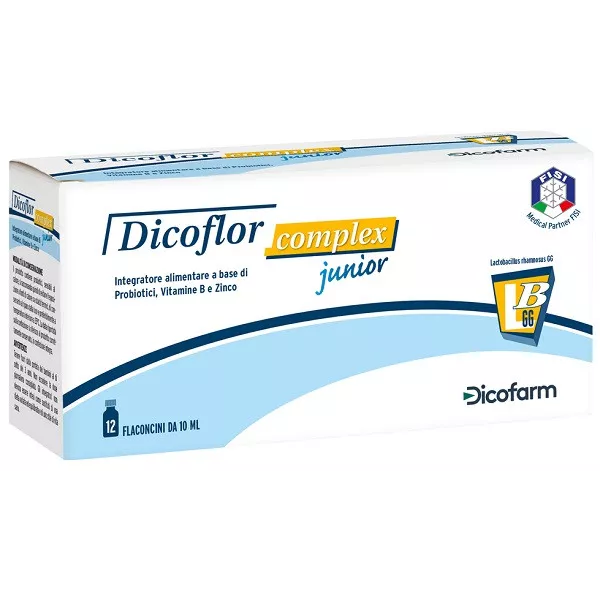 Integratore alimentare a base di vitamine del gruppo B, zinco e probiotici,. Grazie alla presenza dei probiotici, Dicoflor complex junior è indicato per favorire l'equilibrio della flora batterica intestinale. La vitamina B1 e la biotina contribuiscono al normale metabolismo energetico. Le vitamine B2, B6, B12, la niacina, il folato e l'acido pantotenico contribuiscono alla riduzione della stanchezza e dell'affaticamento. Lo zinco contribuisce alla normale funzione del sistema immunitario.