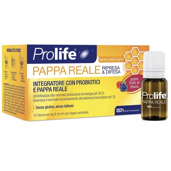 Descrizione Integratore di probiotici, pappa reale, vitamina D, vitamina B12 e acido folico.