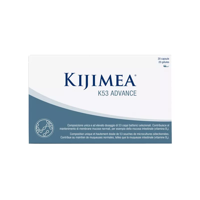 Descrizione Integratore alimentare con 53 ceppi batterici selezionati. Una porzione di Kijimea K53 Advance contiene almeno 21 miliardi di microorganismi vivi. Inoltre Kijimea K53 Advance contiene le vitamine B3 e B7, che contribuiscono al mantenimento di membrane mucose normali.