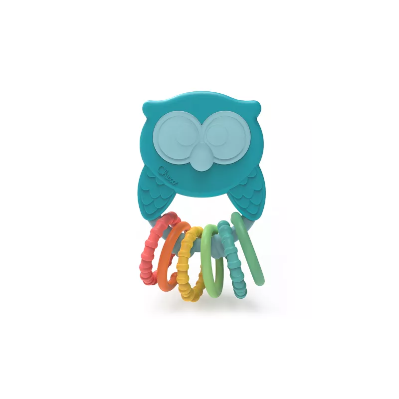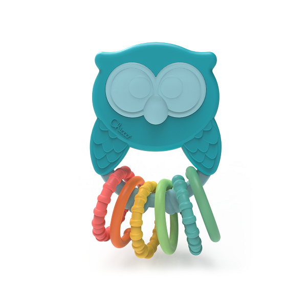 Sonaglio a forma di gufo fatto all'80% di plastica riciclata e bioplastica, con 6 anelli colorati in texture diverse per intrattenere i bambini.