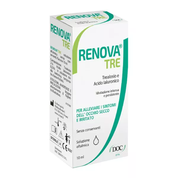 Collirio idratante dall'azione intensiva, adatto per alleviare i sintomi gravi e moderati degli occhi secchi. Grazie all'azione combinata di trealosio e acido ialuronico Renova Tre idrata, lubrifica, ripristina a lungo il film lacrimale. Il dispositivo medico è utilizzabile anche in caso di lenti a contatto. Senza conservanti. Il collirio è adatto in caso di occhi sensibili anche indossando lenti a contatto. L'uso regolare allevia i sintomi degli occhi secchi, prurito, bruciore e sensazione di corpo estraneo, causati da fattori ambientali quali aria secca, vento, fumo, inquinamento atmosferico, luce eccessiva, chirurgia oculare e uso di lenti a contatto.