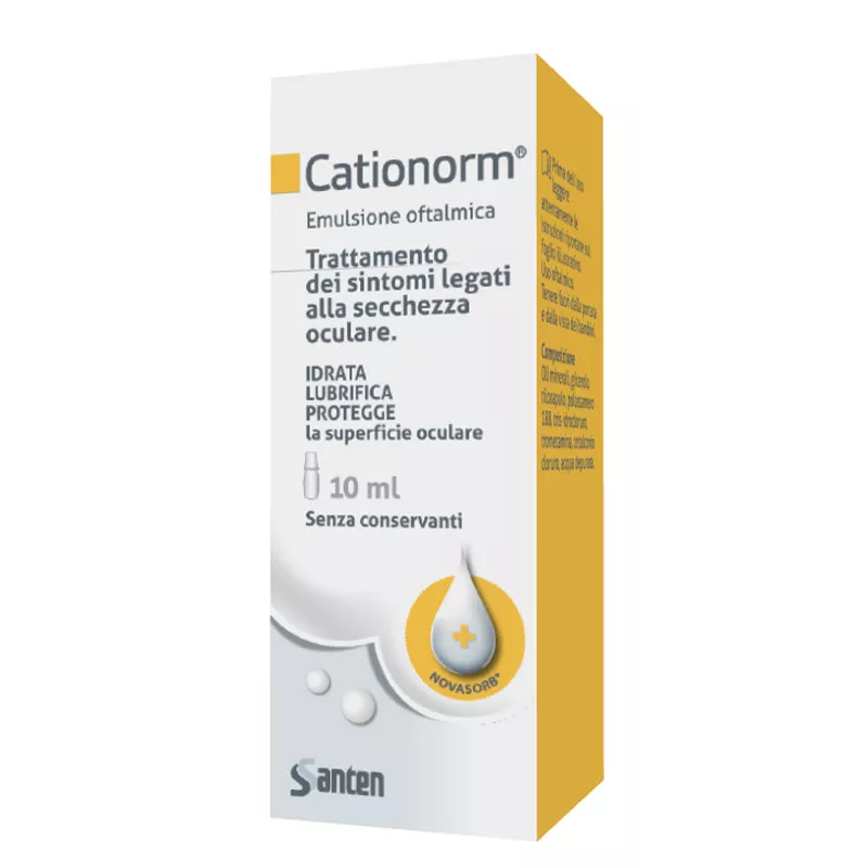 Cationorm è indicato per il trattamento dei sintomi di secchezza oculare come dolore, prurito, bruciore oculare o sensazione di corpo estraneo (granello di sabbia o polvere) negli occhi. Questi sintomi potrebbero essere causati da fattori esterni, quali aria condizionata, inquinamento, viaggi in aereo, lavoro su videoterminali, chirurgia refrattiva, uso di lenti a contatto, ecc., o da patologie, come disfunzione delle ghiandole di Meibomio.