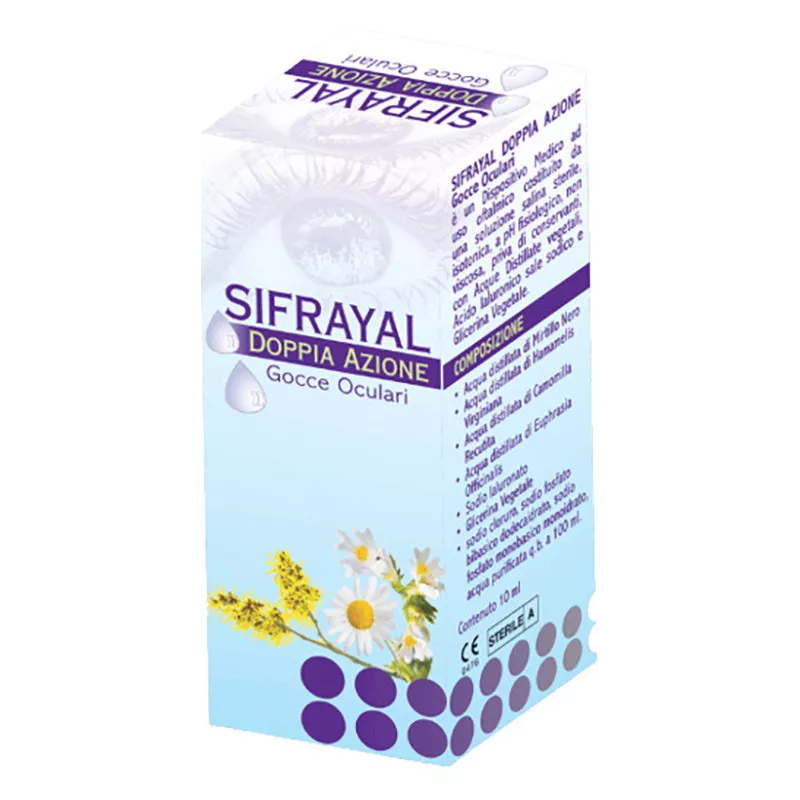 Sifrayal Doppia Azione è un collirio per occhi stanchi, arrossati e affaticati, che svolge un’importante funzione di protezione e sollievo. Lubrifica, rinfresca e allevia situazioni di discomfort oculare e secchezza lieve e occasionale. Attenua sintomi di arrossamento e fastidio dovuti a: inquinamento e smog acqua clorata, salsedine ed esposizione prolungata ai raggi solari, polvere, fumo e vento, ridotto ammiccamento dovuto principalmente all’uso prolungato di dispositivi elettronici, studio intenso o troppo tempo alla guida. Sifrayal Doppia Azione è particolarmente indicato per chi indossa lenti a contatto, sia che siano morbide, rigide e semirigide, in conformità alla norma ISO 11981. Può essere utilizzato sia prima di indossare le lenti a contatto per facilitarne l’applicazione, sia dopo aver messo le lenti a contatto per contrastare la sensazione fastidiosa di secchezza oculare.