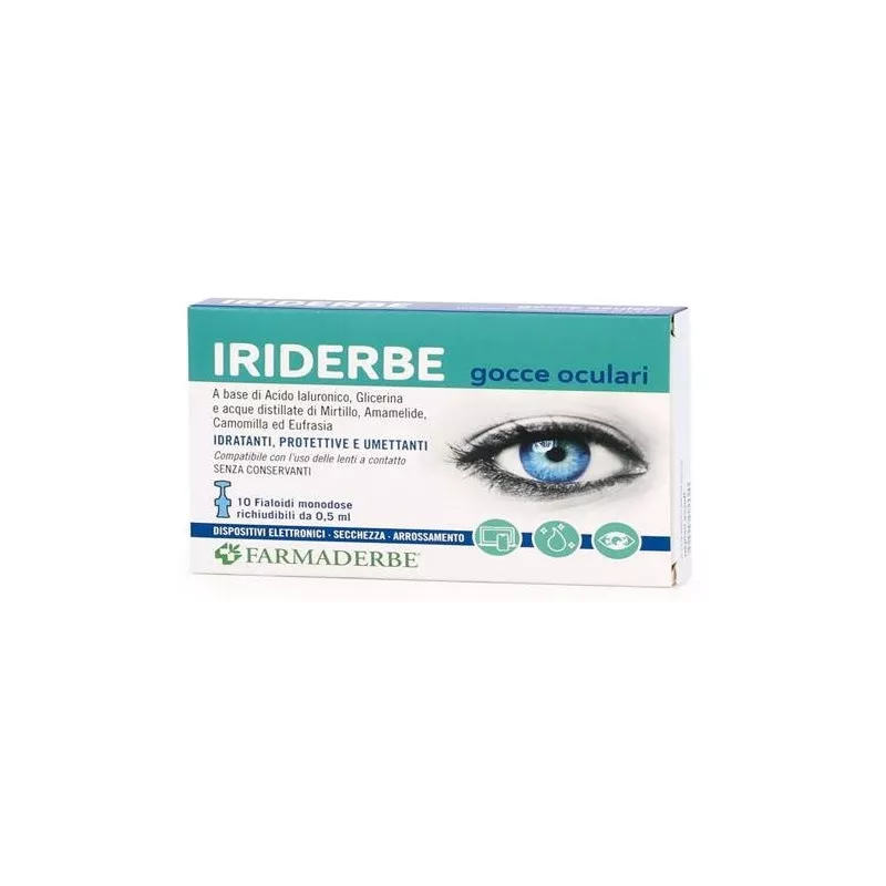 Le gocce oculari Iriderbe sono costitute da una soluzione salina sterile isotonica a pH fisiologico, completamente priva di conservanti ed arricchita con acque distillate di Mirtillo, Amamelide, Camomilla, Eufrasia ad azione rinfrescante utile per alleviare gli stati di arrossamento ed irritazione oculare. L’azione combinata dei componenti naturali, dell’Acido Ialuronico e della Glicerina contenuti in Iriderbe favoriscono l’idratazione e la lubrificazione oculare, alleviando l’arrossamento ed il senso di fastidio causati dalla secchezza oculare occasionale indotta da fattori ambientali (ad esempio raggi solari, salsedine, vento, polvere, fumo), uso prolungato del computer, studio intenso, guida prolungata. Il prodotto è indicato per un uso frequente e prolungato e si presta ad essere utilizzato in associazione alle lenti a contatto per renderne più facile l’applicazione e più confortevole l’utilizzo.