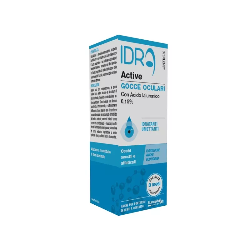 Idra Active è una soluzione sterile, idratante, lubrificante e umettante con acido ialuronico. L'acido ialuronico è un polimero naturale altamente tollerato, presente nel film lacrimale; ha la proprietà di lenire l'irritazione della superficie dell'occhio, mantenendolo idratato in modo ottimale.
