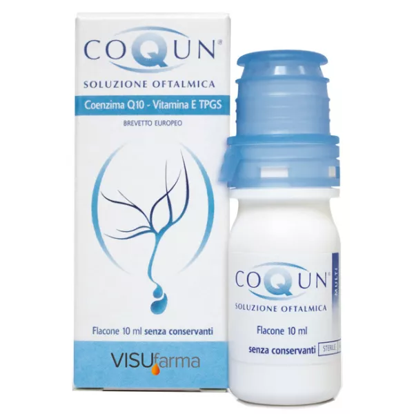 Soluzione oftalmica sterile in flacone da 10 ml senza conservanti con coenzima Q10 e vitamina E TPGS, due molecole ad azione antiossidante. COQUN è indicato come trattamento complementare alla terapia ipotonizzante nel glaucoma, grazie alla sua capacità di contrastare i danni ossidativi strettamente legati alla patologia.