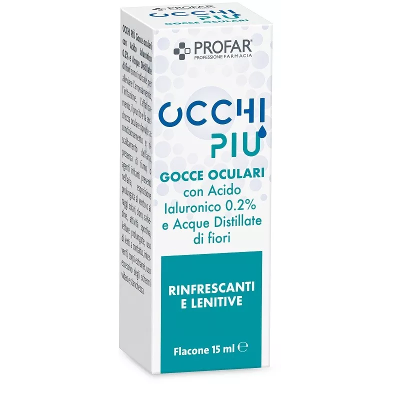Gocce oculari con acido ialuronico e acque distillate di fiori. È una soluzione sterile, ottenuta per filtrazione, isotonica contenente sodio ialuronato ed acque distillate di fiori come ingredienti principali. Indicate per alleviare l'arrossamento, l'irritazione, l'affaticamento, il prurito e la secchezza oculare dovute a condizionamento e riscaldamento dell'aria, soggiorno in ambienti con presenza di fumo, o di altri tipi di inquinamento dell'aria, esposizione prolungata al vento o ai raggi solari, cloro, nel caso si pratichi il nuoto in piscina o salsedine se tale attività è svolta in mare, attività sportive in genere, intenso impegno per lo studio o il lavoro, uso di lenti a contatto, traumi post-operatori, corpi estranei, uso eccessivo degli schermi, video e stanchezza. Sia le materie prime che entrano nella formulazione di gocce oculari che la soluzione come tale sono soggette a rigorosi controlli di qualità ed accurate analisi.