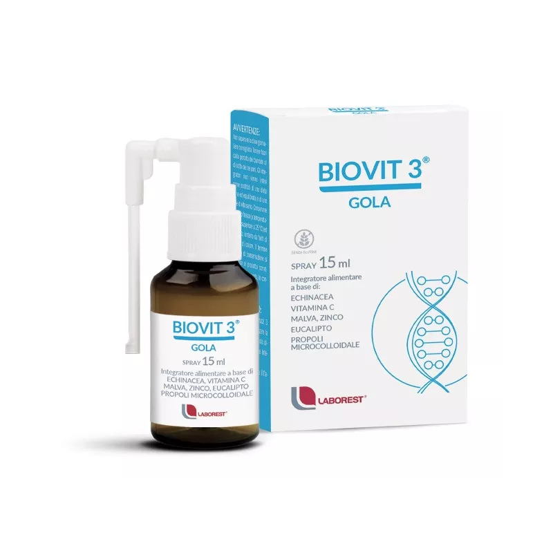Modalità d'uso Si consigliano 2 spruzzi 3 volte al giorno. Spruzzare la soluzione, indirizzandola direttamente sulla parte interessata (bocca, gola). La prima volta che si utilizza Biovit 3 Gola, seguire le seguenti istruzioni: estrarre l'erogatore dall'apposita bustina. Montare l'erogatore sul flacone. Rimuovere il tappino dall'erogatore e premere 2-3 volte sulla pompa fino alla fuoriuscita della prima nebulizzazione. Una volta che il flacone è montato, procedere all'applicazione del prodotto: agitare bene prima dell'uso, ruotare la cannula erogatrice di 90°, rimuovere il tappino dall'erogatore e spruzzare il prodotto localmente. Riporre il tappino sull'erogatore. Biovit 3 Gola può essere assunto anche da soggetti con intolleranza o sensibilità al glutine.