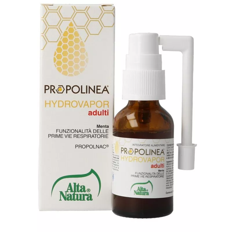 Propolinea Hydrovapor Adulti, a base di Propolnac miscela di propoli M.E.D. con N-acetilcisteina. I principi attivi contenuti nell'estratto di erisimo favoriscono un effetto emolliente e lenitivo della mucosa orofaringea, il balsamo del tolù agisce sulla fluidità delle secrezioni bronchiali. Con semi di pompelmo, olio essenziali di eucalipto ad effetto balsamico ed olio essenziale di menta utile per la funzionalità delle prime vie respiratorie.