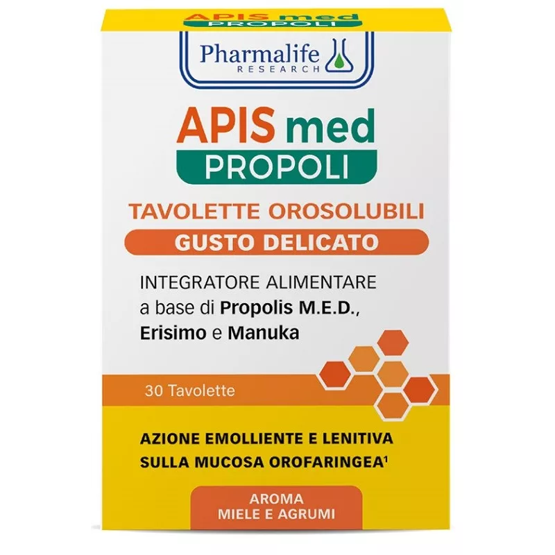 Descrizione Integratore alimentare in compresse da sciogliere in bocca contenente propoli, manuka ed estratti vegetali. La propoli impiegata è ottenuta tramite un processo produttivo brevettato di multi estrazione dinamica, che consente di eliminare la cera e le altre impurità e di ottimizzare la standardizzazione dell’estratto nel complesso dei 6 polifenoli principali. L’erisimo e il lichene islandico1 favoriscono un’azione emolliente e lenitiva sulla mucosa orofaringea.